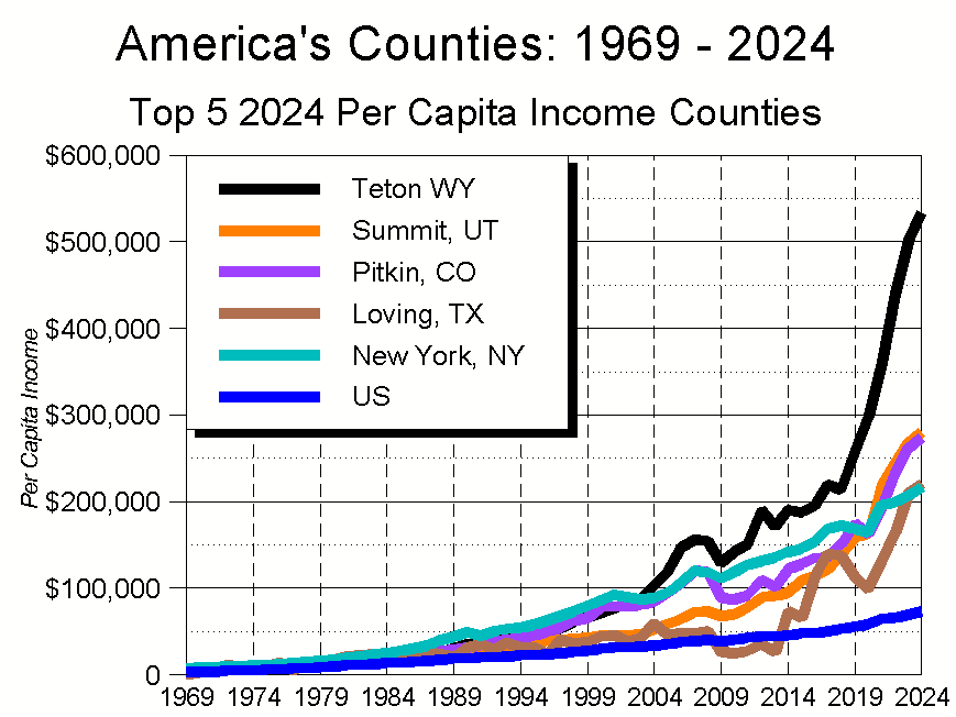 Between 2018-2024, Teton WY’s nation-leading per capita investment income figure went from $149,473 to $411,446, an increase of 175%. For the nation as a whole, the figures were $10,518, $15,342, and 46%.