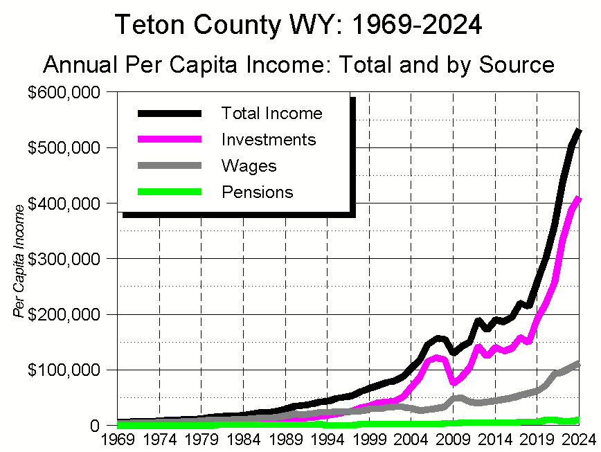 In 2024, Teton County was home to 4% of Wyoming’s 587,618 residents. Combined, those 4% accounted for 24% of the Wyomingites’ total income, and fully half their investment income. As a result, Teton County’s 2024 PCI of $532,903 was over six times greater than Wyoming’s statewide PCI of $86,477. In fact, remove Teton County from the mix and Wyoming’s statewide PCI drops by over 20%, to $68,068.