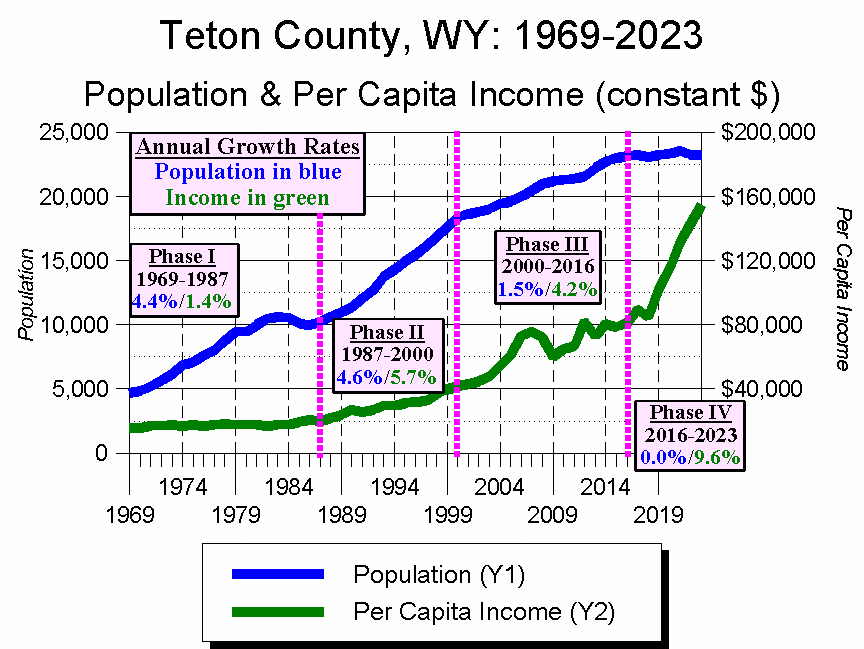 During the ski area’s first two decades, Teton County, Wyoming’s population grew far more rapidly than its income. Specifically, between 1969-1987 Teton County’s population grew at a Compounded Annual Growth Rate (CAGR) of 4.4%, while its inflation-adjusted per capita income grew one-third as fast: 1.4%.